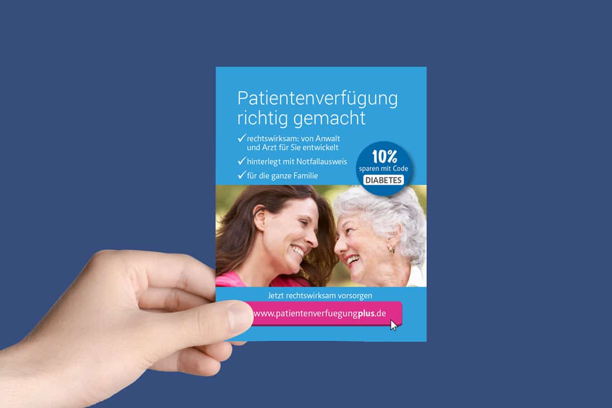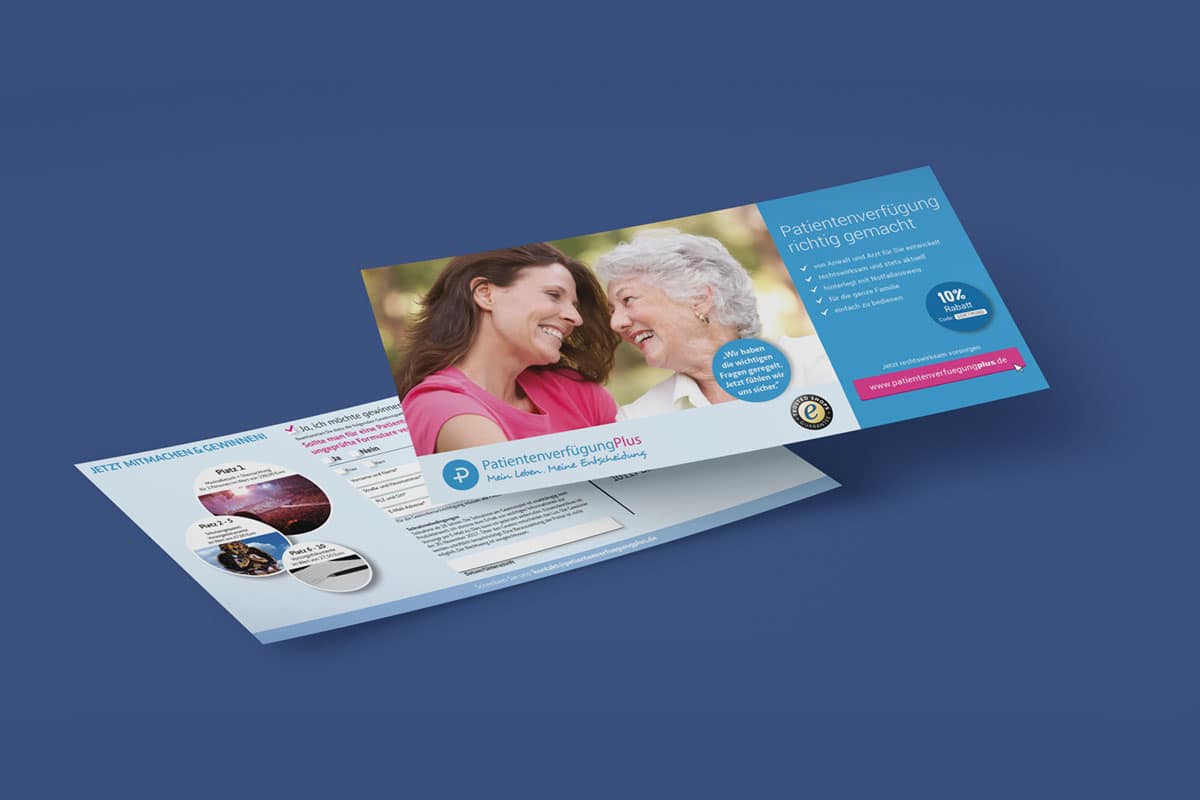 Das Unternehmen beauftragte die DSW mit der Entwicklung eines Kommunikationskonzeptes für die Zielgruppe BestAger. Es galt, das Online-Portal PatientenverfügungPlus innerhalb dieser für das Unternehmen relevanten Zielgruppe bekannt zu machen und mögliche Hemmschwellen hinsichtlich dieses emotionalen Themas zu senken. Zu diesem Zweck entwickelte die DSW eine Sampling-Postkarte mit einem Rabattcode sowie einem attraktiven Gewinnspiel. Diese wurde als Beilage in der Glückstüte® an die Zielgruppe übergeben.