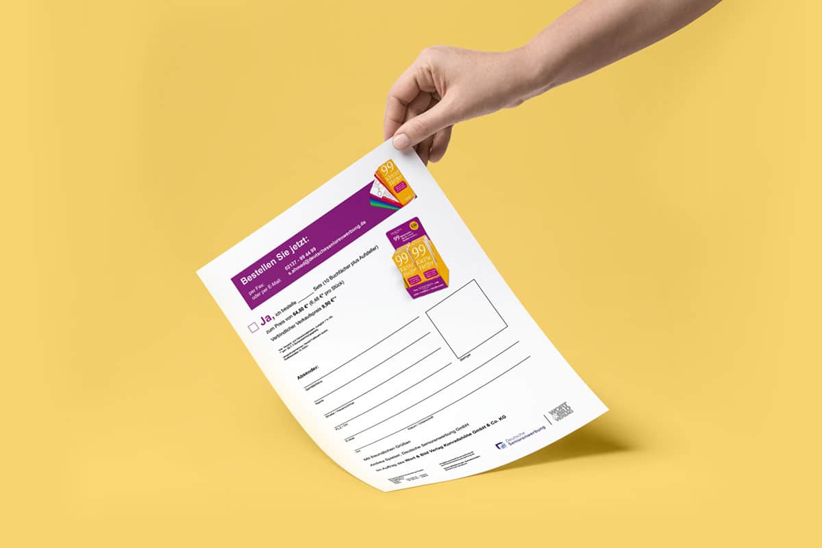 Exklusiv für die Leitung der Seniorenresidenz umfasste die Aussendung zudem ein Ansichtsexemplar der Ausgabe „99 kleine Helfer” des Wort & Bild Verlages sowie 10 Produktflyer zur Auslage in den allgemeinen Aufenthaltsräumen oder auf der Empfangstheke der Residenz.